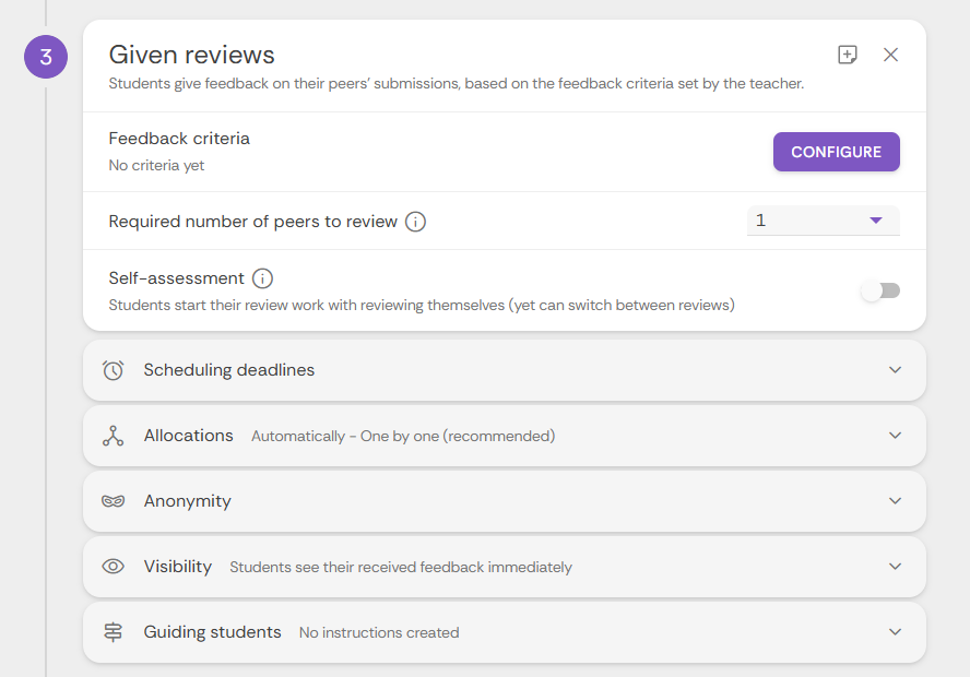 - Scheduling deadlines: hier kun je een deadline invullen waarna er geen reviews meer gegeven mogen worden.
